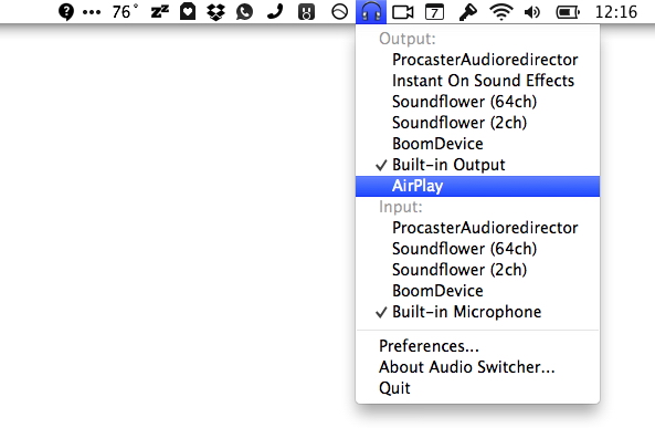 AudioSwitcher is a menu bar that allows you to switch quickly