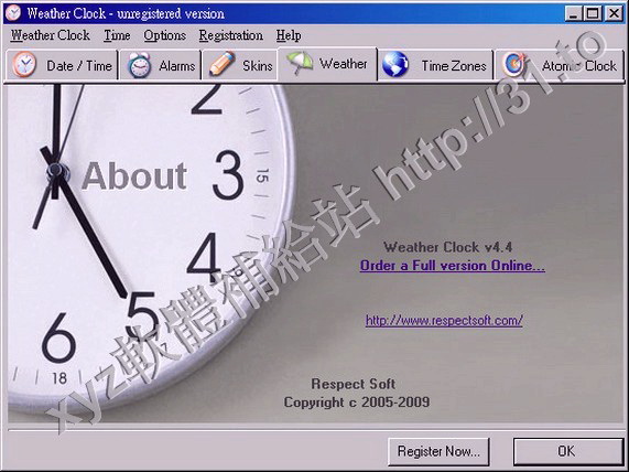 Respect Soft Weather Clock v3.1 英文正式版(能夠顯示時間日期和所在地的溫度和氣象,提示提供鬧鐘功能的軟體)